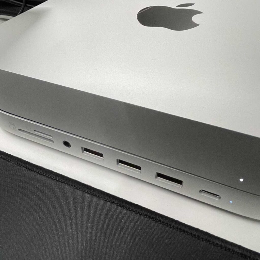 MacMini + 外部ディスプレイで仕事もサクサクだぜ!、、、と思ってたのですが。デバイスを指す箇所が真裏しかない?! おいおいクール追求しすぎてなんにもなくしてしまっとるやないかい! このまま使い続けるのはシーキビすぎる😭という事で買ってみたこのハブ。まるで純正?と見紛うほどに一体化してます。